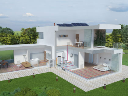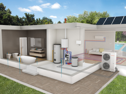 Splitové provedení hybridního tepelného čerpadla znamená, že čerpadlo je rozděleno na dvě základní části, konkrétně na venkovní a vnitřní jednotku. |