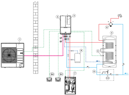 | 2 | Vnitřní jednotka tepelného čerpadla | 7 | Hydraulický zónový rozdělovač (2 zóny) |