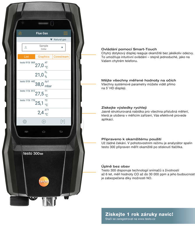 Průmyslové vytápěníAnalyzátor spalin testo 300 Longlife v akční sadě "Black" je multifunkční přístroj nejen pro analýzu spalin. Velký 5palcový HD dotykový displej a přehledně strukturovaná menu jednotlivých měření zásadně zjednodušují ovladatelnost přístroje. Intuitivní menu měření a chytrý dotykový displej s rychlou odezvou zajišťují snadné ovládání – jako na vašem chytrém telefonu. Analyzátor v akční sadě je osazen dvěma senzory O2 LL a COH2 LL s H2 kompenzací, které mají základní záruku 4 roky. Při registraci přístroje do 30 dní od jeho koupi se záruka prodlužuje o jeden rok.