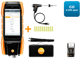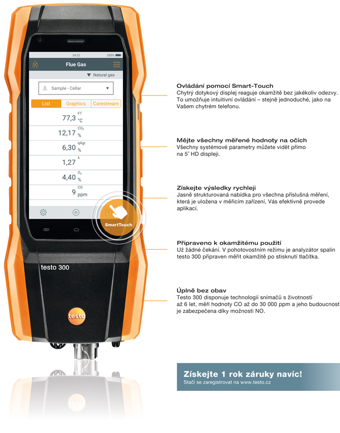 Průmyslové vytápěníAnalyzátor spalin testo 300 v akční sadě je multifunkční přístroj nejen pro analýzu spalin. Velký 5palcový HD dotykový displej a přehledně strukturovaná menu jednotlivých měření zásadně zjednodušují ovladatelnost přístroje. Intuitivní menu měření a chytrý dotykový displej s rychlou odezvou zajišťují snadné ovládání – jako na vašem chytrém telefonu. Analyzátor v akční sadě je osazen dvěma senzory O2 a CO, které mají základní záruku 2 roky. Při registraci přístroje do 30 dní od jeho koupi se záruka prodlužuje o jeden rok.
